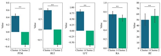 Paired-sample t-test of PTM, RLT, LFT, RA, and RT. PTM: Proportional time on matrix; RLT: Rate of latency to first toggle; LFT: Latency to first toggle; RA: response accuracy; RT: response time. Error bar is the 95% confidence interval of the overall mean. ** represents p < 0.01, sample N = 36.