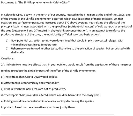 Two instruments were applied. The first of these was the adapted critical thinking tasks questionnaire (Palma Luengo et al. 2021), which measures the critical thinking variable based on 15 open and closed questions, evaluated via a rubric with values between 0 and 2 pts. The items are organized into 5 dimensions (inquiry, analysis, argumentative communication, metacognition, and motivation), in a mixed format that includes multiple choice and writing responses, like is shown in Figure 1. Adequate internal consistency values have been reported, with an overall Cronbach’s α between 0.67 and 0.78 (Palma Luengo et al. 2021; Ossa Cornejo et al. 2023).