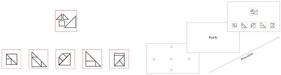 Figure 1 displays a sample item from the OA test, which includes a stem, positioned at the top center of the screen, with five options arranged below it. The task for participants is to select the option that can be formed using the pieces presented in the stem. To the right of Figure 1, the test sequence is outlined, beginning with a five-point calibration technique to fine-tune the participant’s gaze coordinates before starting the response sequence. This was followed by a preliminary “ready” indicator at the center of the screen that required the participant’s gaze before moving on to the next item via mouse click. After selecting an answer choice by clicking one of the options on the screen, participants then repeated this process for each subsequent question until the test was completed.