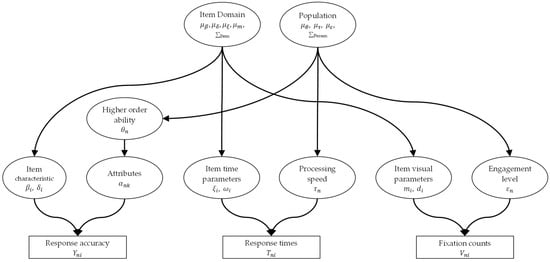In the MJ-DINA model, variables such as (response accuracy), (log-transformed response time), and (fixation counts) are modeled individually at the first level; at the second level, two latent structures for variance and covariance are incorporated to account for correlations among item and person parameters respectively, shown as Figure 2: