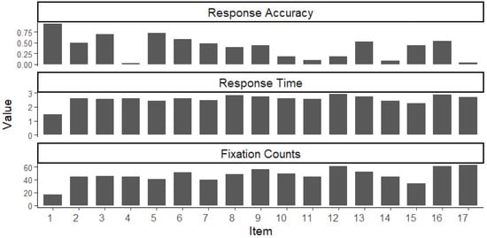 In the top panel of Figure 3, Classical Test Theory (CTT) was used to analyze response accuracy (RA) for all seventeen items. The items ranged in accuracy rate from 94% for item 1 to 2% and 4% for item 4/17, suggesting a reasonable range of accuracy rates across items, reflecting varying levels of difficulty.