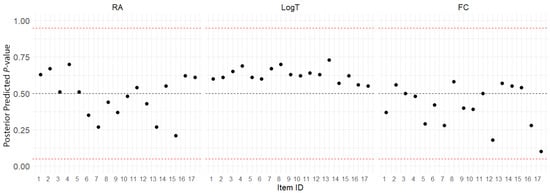 Modeling convergence was assessed using the Gelman–Rubin statistic, also known as . As shown in Table 4, all item parameters demonstrated values approximately equal to 1.00, indicating adequate convergence to the stationary distribution. Typically, below 1.1 or 1.2 indicates good convergence, demonstrating sufficient exploration of the parameter space (Brooks and Gelman 1998).