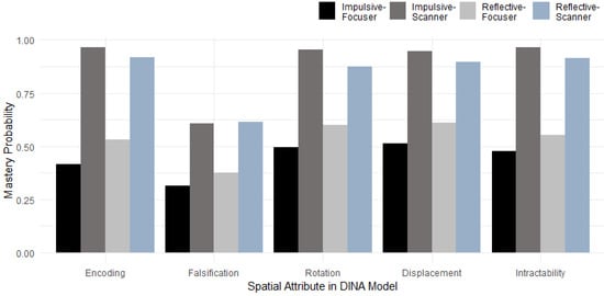 To answer the third question, we utilized a higher-order DINA model in the MJ-DINA model to explore the impact of general problem-solving strategies on individuals’ performance in spatial attributes (e.g., encoding). Our results indicate that the falsification attribute had the lowest mastery rate across all four problem-solving strategy groups, yet it was the strongest predictor of spatial reasoning success. This result aligns with previous research showing that effective problem solvers spend more time to check errors and test hypotheses, a crucial aspect of falsification (Popper 1963; Lam 2007). Moreover, individuals who tend to use falsification outperform those who solely rely on confirmation bias (Nickerson 1998). Our findings extend this idea into the spatial reasoning domain, demonstrating that falsification may be the key differentiator in high spatial reasoning performance. However, in the previous theory that mental rotation is the critical determinant of spatial ability (Shepard and Metzler 1971), our findings suggest that falsification is more critical. In future studies, we should investigate whether explicit training in falsification strategies can improve spatial task performance, especially for OA tasks.