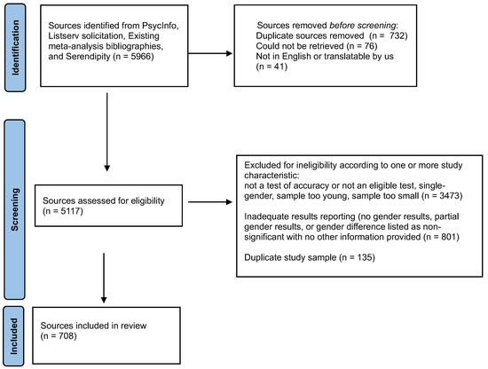 The total number of screened sources was 5966. Of these, 708 produced one or more effect sizes (in the source or on request) and these comprised the database analyzed in the present article. (See Supplementary Materials File S2 for citations to the included sources.) The Preferred Reporting Items for Systematic Reviews and Meta-Analysis (PRISMA) flow chart (Figure 1) illustrates why 5258 sources were excluded. Of note, 141 sources were not used because they provided only the statement that the gender effects were “nonsignificant” or presented only partial gender results for the accuracy test (e.g., for only some of the emotions included in the test). Although sometimes meta-analysts impute an effect size of zero for “nonsignificant” results, we did not do that because of the strong a priori likelihood that unknown effect sizes favored females. Therefore, studies for which “nonsignificant” was the only information available were omitted from analysis. Studies reporting only partial results were omitted because these would likely have been the only significant comparisons and therefore overestimates of the test’s overall gender result.