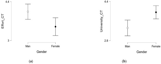 Regarding the variables “age” and “graduate–postgraduate”, no significant differences are obtained with any of the variables under study. Significant differences are obtained when we assess the differences between the sexes. Men believe that CT involves greater effort, while women believe that the university favors CT more than men do (Table 7 and Figure 1). Considering that when comparing samples we could not use parametric tests, since they do not comply with the principle of the homogeneity of the variances of the analyzed dependent variables, we used non-parametric tests to assess the possible differences between samples, with gender and work as dependent variables.