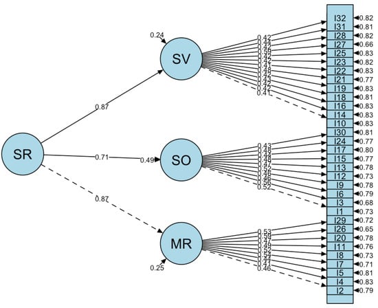 Figure 1 illustrates the second-order three-factor model of spatial reasoning derived from the CFA. The standardized factor loadings of the items range between 0.413 and 0.587, with all p-values for the factor loadings being less than 0.01, and most being less than 0.001, indicating significant relationships between the first-order factors and their respective items. The factor loadings of the three first-order factors—mental rotation (MR), spatial orientation (SO), and spatial visualization (SV)—on the second-order factor, spatial reasoning ability (SR), are 0.868, 0.715, and 0.872, respectively, indicating strong correlations between the second-order factor and the three first-order factors. This suggests that all three constructs effectively measure spatial reasoning ability. Based on this analysis, the test demonstrates good construct validity.