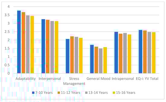 The analysis of descriptive statistics, based on raw scores for each total and subscale of the EQ-i:YV, revealed variations across different age groups (Table 3). These results suggest trends that must be interpreted with caution, as they are based on raw subscale scores, which are not directly comparable due to differences in the number of items per subscale.