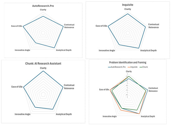 The radar charts (Figure 2) represent a comparison of three GenAI tools (Autoresearch.pro, Inquisite, Chunk AI) that are used for the Problem Identification and Framing step across five criteria for evaluation: Clarity, Context Relevance, Analytical Depth, Innovative Angel, and Ease of Use.