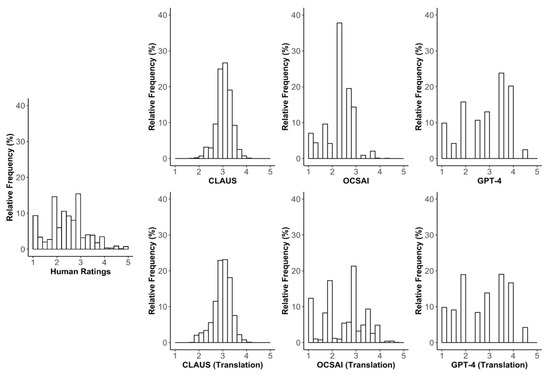 Human ratings were concentrated in the lower to mid-range, forming a distribution that tends to be right-skewed. CLAUS scores exhibited a narrower and more symmetric distribution in both datasets, resembling a compressed normal distribution. OCSAI scores exhibited a distribution with a noticeable right skew in the German dataset, with specific values being clearly overrepresented, e.g., about 61.5% of scores fell into the 2.x range in the German dataset (37.8% 2.3), and the scores 1, 2, and 3 together accounted for 94.2% in the English dataset. GPT-4 scores exhibited a relatively wide distribution in both datasets, with certain scores being overrepresented, reflecting that, even when asking for a differentiated rating (originally 10–50), GPT-4 mostly still resorted to a less differentiated rating (i.e., 10, 15, 20, 30, 35, 50, which was then transformed to 1–5). Full descriptive statistics for each method are presented in the Supplemental Analyses (see Table S4).