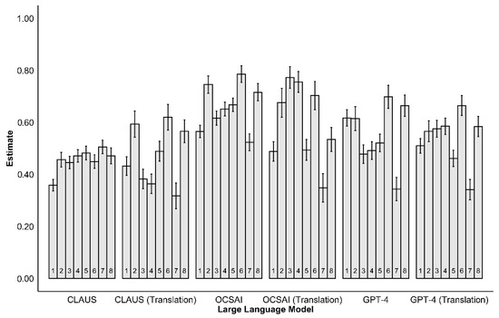 For explorations of potential language effects and to compare models with different language capabilities under standardized output conditions, all responses were translated into English using DeepL (https://www.deepl.com, accessed on 12 September 2024). The accuracy of the translation was examined with a systematic cross-check of 1000 randomly drawn responses across datasets. A student assistant majoring in Psychology and English Studies reviewed the translations and categorized them into three categories: (1) “I would translate it exactly the same”, (2) “Translation is inappropriate”, or (3) “Not sure”. This process allowed us to quantify translation accuracy and identify potential issues. In only 6.0% of these responses, a different translation approach was suggested, while in 2.4% of the cases, the translation appeared inappropriate (mostly in cases of spelling errors, ambiguous phrasing, or incomplete responses), indicating overall good translation quality. Nevertheless, DeepL has consistently demonstrated high translation quality in dependent evaluations, particularly for preserving context and idiomatic meaning (e.g., Kamaluddin et al. 2024; Linlin 2024). In our analysis, the original DeepL translations were used without further corrections in order to reflect the aims of an automated scoring pipeline.