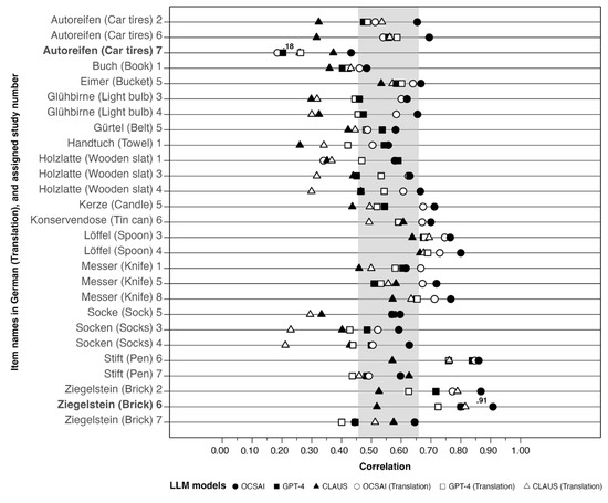 For CLAUS, correlations in the German dataset exhibited moderate variability, spanning from r = 0.26 (Towel, Study 1) to r = 0.66 (Spoon, Study 4). Similarly, in the translated dataset, correlations ranged from r = 0.21 (Socks, Study 4) to r = 0.81 (Brick, Study 6). Notably, only 14.8% of the items in the German dataset achieved correlations of r ≥ 0.60, compared to 22.2% in the translated dataset. For OCSAI, correlations in the German dataset ranged from r = 0.43 (Car tires, Study 7) to r = 0.91 (Brick, Study 6), with 51.9% of the items achieving correlations of r ≥ 0.65. In the translated dataset, correlations ranged from r = 0.18 (Car tires, Study 7) to r = 0.85 (Pen, Study 6), with 37.0% of items reaching correlations of r ≥ 0.65, reflecting slightly lower consistency compared to the German datasets. For GPT-4, correlations in the German dataset ranged from r = 0.20 (Car tires, Study 7) to r = 0.84 (Pen, Study 6). Of these, 22.2% achieved correlations of r ≥ 0.65, while 64.2% reached r ≥ 0.50. In the translated dataset, correlations ranged from r = 0.26 (Car tires, Study 7) to r = 0.76 (Pen, Study 6). Here, 18.5% of items achieved correlations of r ≥ 0.65, while 58.0% reached r ≥ 0.50, showing a slight decline compared to the German dataset.