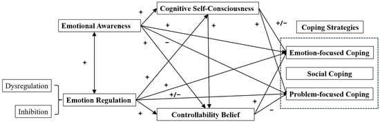 We hypothesized that dysregulation and inhibition would be associated with poor emotional awareness, which would in turn predict the decreased use of problem-focused coping and increased emotion-focused coping. We anticipated that these effects would operate both directly and indirectly through low cognitive self-consciousness and controllability beliefs. Due to limited evidence, we made no specific predictions for social coping in relation to metacognitive beliefs.