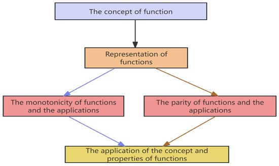 In this study, directed graphs were employed to represent the cognitive model of a given knowledge module. The detailed steps can be found in (Zhang et al. 2024). Employing interpretive structural modeling (ISM) to construct cognitive models combines objectivity and efficiency, not only clearly elucidating the intrinsic features of knowledge domains but also aligning closely with the inherent logic of the discipline. After constructing a preliminary cognitive model of the module “Concepts and Properties of Functions” using ISM, it is necessary to revise the model using the expert method. In this model revision of all the modules, six professionals in mathematics education were invited to participate in a 2-h open seminar, where they provided modification recommendations. The paper used the revision of the cognitive model for the module “Concepts and Properties of Functions” as an example to elaborate on the method. Based on the preliminary directed graph and expert recommendations, it was identified that the influence of “the concept of function” on “monotonicity and application” and “parity and application”, respectively, the influence relationship between “function representation” and “application of function concept and properties,” and the influence relationship between “function concept” and “application of function concept and properties” are not clearly reflected in mathematics. Consequently, the four directional edges mentioned were removed from the model, resulting in the finalized cognitive model for this module, as shown in Figure 3.