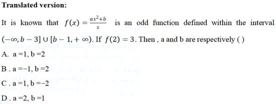 After the above process, the subsequent step involves selecting test items that meet the requirements of corresponding knowledge attributes based on the finalized Q-matrix. The test items used in this study were sourced from three categories: 50% were textbook exercises aligned with curriculum standards, 30% were selected from previous Gaokao (National College Entrance Examination) mathematics multiple-choice questions, and 20% were original items developed for this study. All items were appropriately adapted to meet specific research requirements. In the item design process, this study established a proposition team composed of five high school mathematics teachers to develop the test items. Additionally, the study strictly adhered to the item-attribute mapping relationship defined in the Q matrix—each multiple-choice or fill-in-the-blank question corresponded exclusively to one specific knowledge attribute in the Q matrix. For example, for attribute A1 of module “Concepts and Properties of Functions”, the corresponding test item was designed as shown in Figure 4—this item exciusively assessed students’ mastery of the concept of function. In addition, drawning on Bloom’s Taxonomy of Educational Objectives, the design of the test items for each module in this study also incorporated consideration for the division of cognitive levels. Specifically, items were categorized into three levels: memory, comprehension, and application. The memory level assessed students’ ability to recall basic concepts or formulas; the comprehension level evaluated their understanding of knowledge and capacity for simple application; and the application level measured their ability to integrate knowledge to solve complex problems (as shown in Figure 5, where students are required to comprehensively apply function knowledge to solve problems). All items were formatted as four-option multiple-choice questions, and this design approach was consistently applied to the remaining 10 knowledge modules.