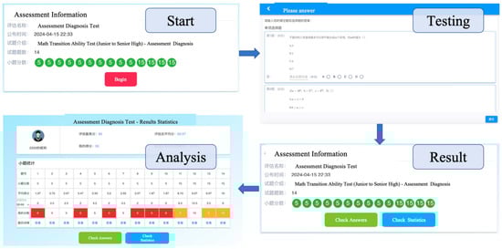 At J1 School, a total of 584 Grade 11 (Senior High Year 2) students from 12 classes participated in the “Equations and Inequalities” module assessment. Prior to the test, each student was assigned a unique username and password to ensure secure access. To guarantee the validity of the assessment, the school conducted it in a centralized manner with a standardized testing period of 90 min. Upon completion of the test, each student’s response data, along with the corresponding Q-matrix for the administered items, were systematically archived and forwarded to the assessment model for diagnostic scoring. The specific operational procedures and interface used by students during this process are delineated below.