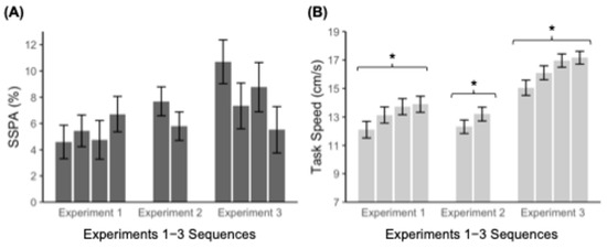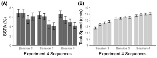 The primary measure of sequence learning is the increased accuracy during task performance when the cues follow the practiced repeating sequence compared with periods where the cue order does not. The Sequence Specific Performance Advantage (SSPA) is calculated as a subtraction score of response accuracy (percent correct) for a series of trials within the practiced repeating sequence compared with accuracy during novel repeating sequences (% correct repeating trained sequence − % correct untrained sequences). SSPA is reported in units of percent correct (%). In each of the SISL protocols used across the experiments reported here, participants complete an initial training phase that primarily contains repetitions of a sequence to be learned, followed by a test phase that contains repetitions of that sequence and blocks of repetitions of two foil sequences (also with SOC structure). SSPA is also calculated at test as the differential accuracy between the trained and untrained sequences. Positive scores reflect better performance on the trained sequence that can only be due to the learner’s experience with that sequence prior to the test. Chance performance on this measure is 0%, reflecting no difference in accuracy and no sequence-specific learning.