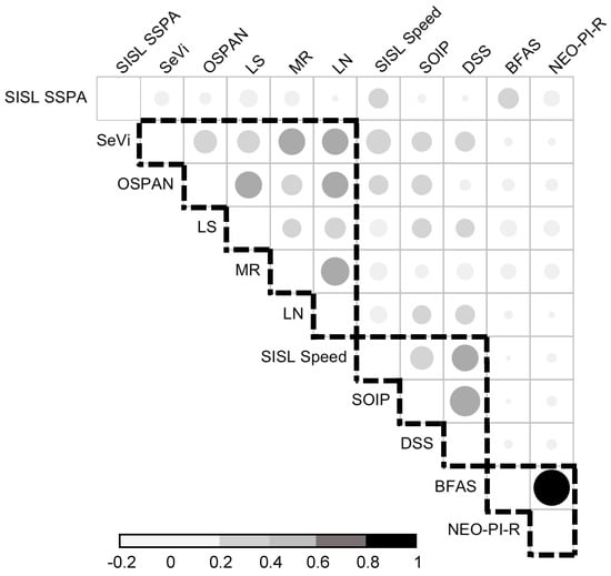 Figure 6 shows correlations among all cognitive measures completed during the first session, with SISL SSPA, SISL Speed, and SeVi working memory span averaged across sessions 2–4, and with