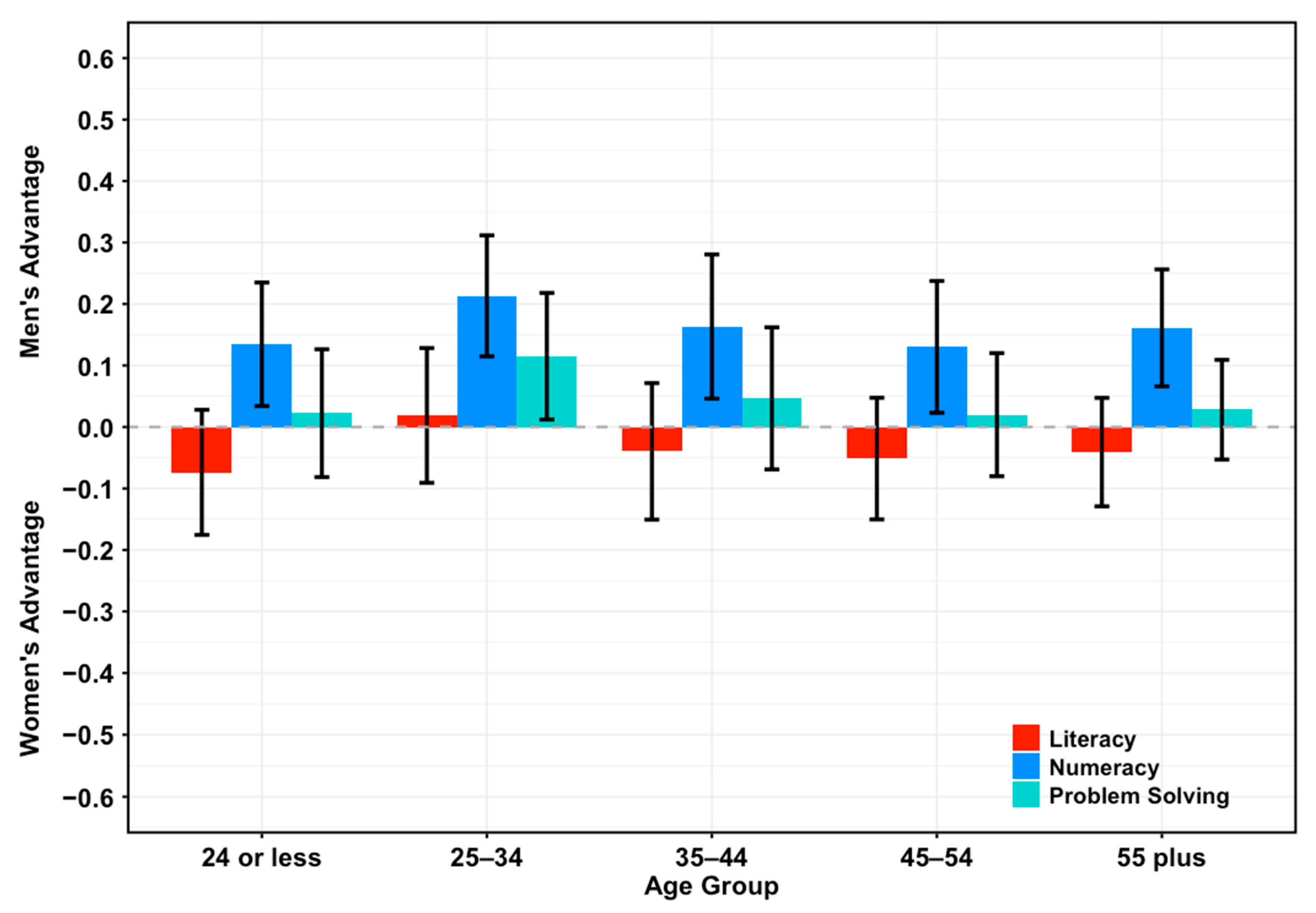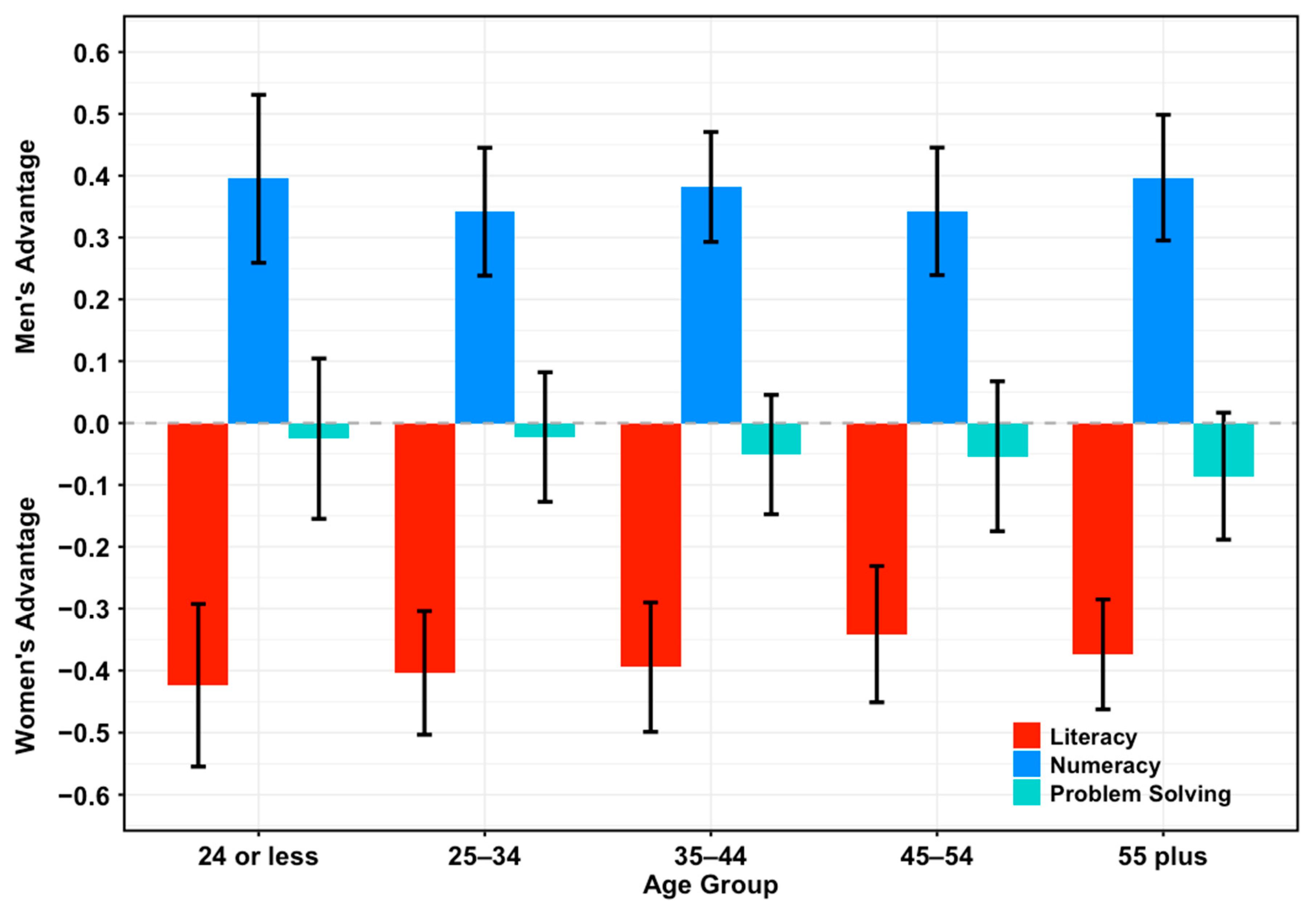 - In contrast, we do not expect to find significant differences in problem-solving overall and across age groups, as this skill relates to the ability to achieve a goal in a dynamic situation (OECD, 2021) and likely relies on cognitive processes related to both numeracy and literacy.