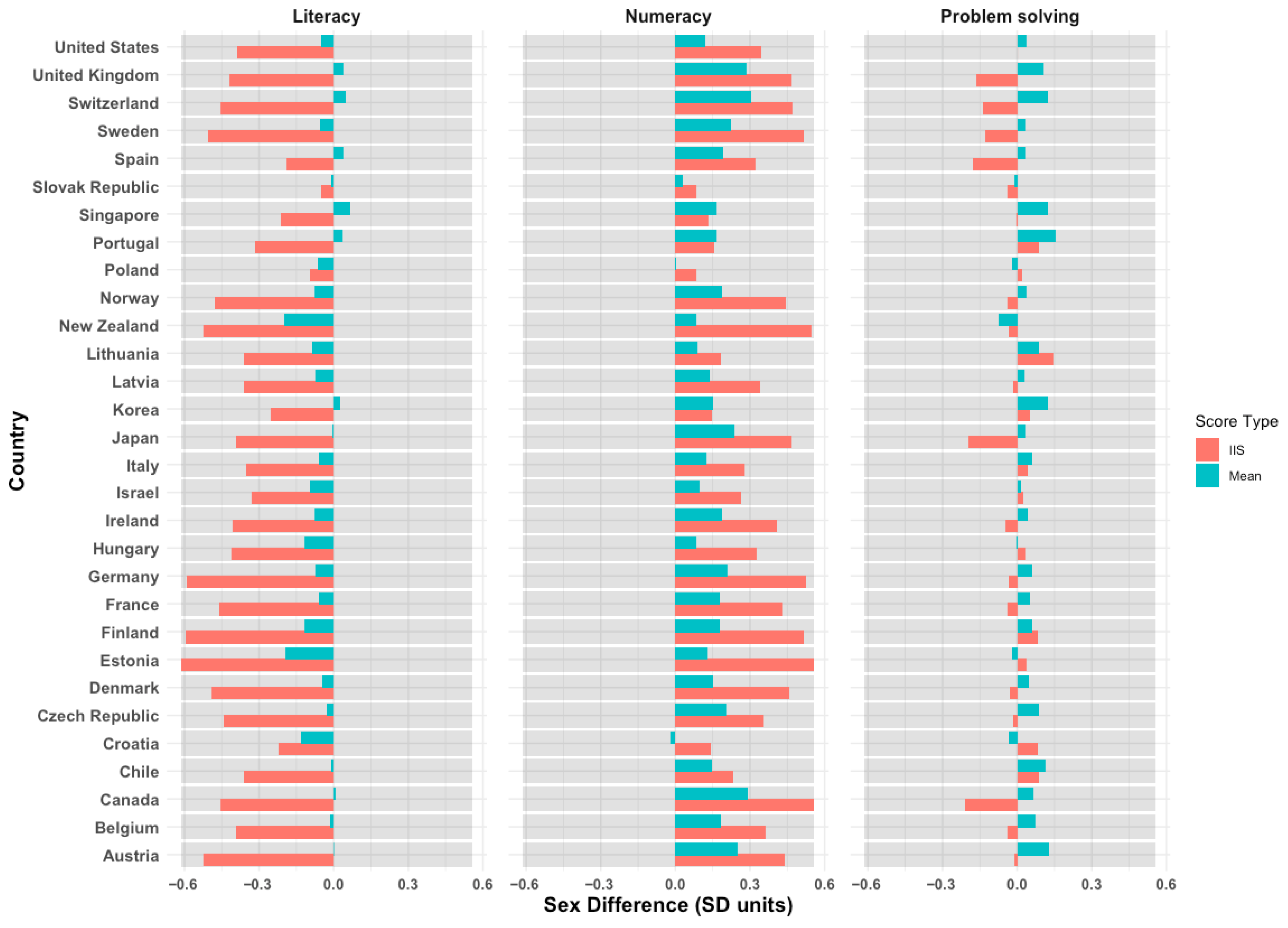 - First, we assessed sex differences in mean scores—rather than intraindividual strengths—in literacy, numeracy, and problem-solving overall, by country, and across age groups. This approach enabled a direct comparison between the magnitude of sex differences in mean scores and intraindividual strengths. We used the repest command in STATA to calculate these differences at the country level. This command employs BRR replicate weights, ensuring that data clustering and sampling errors are properly accounted for, resulting in unbiased standard errors.