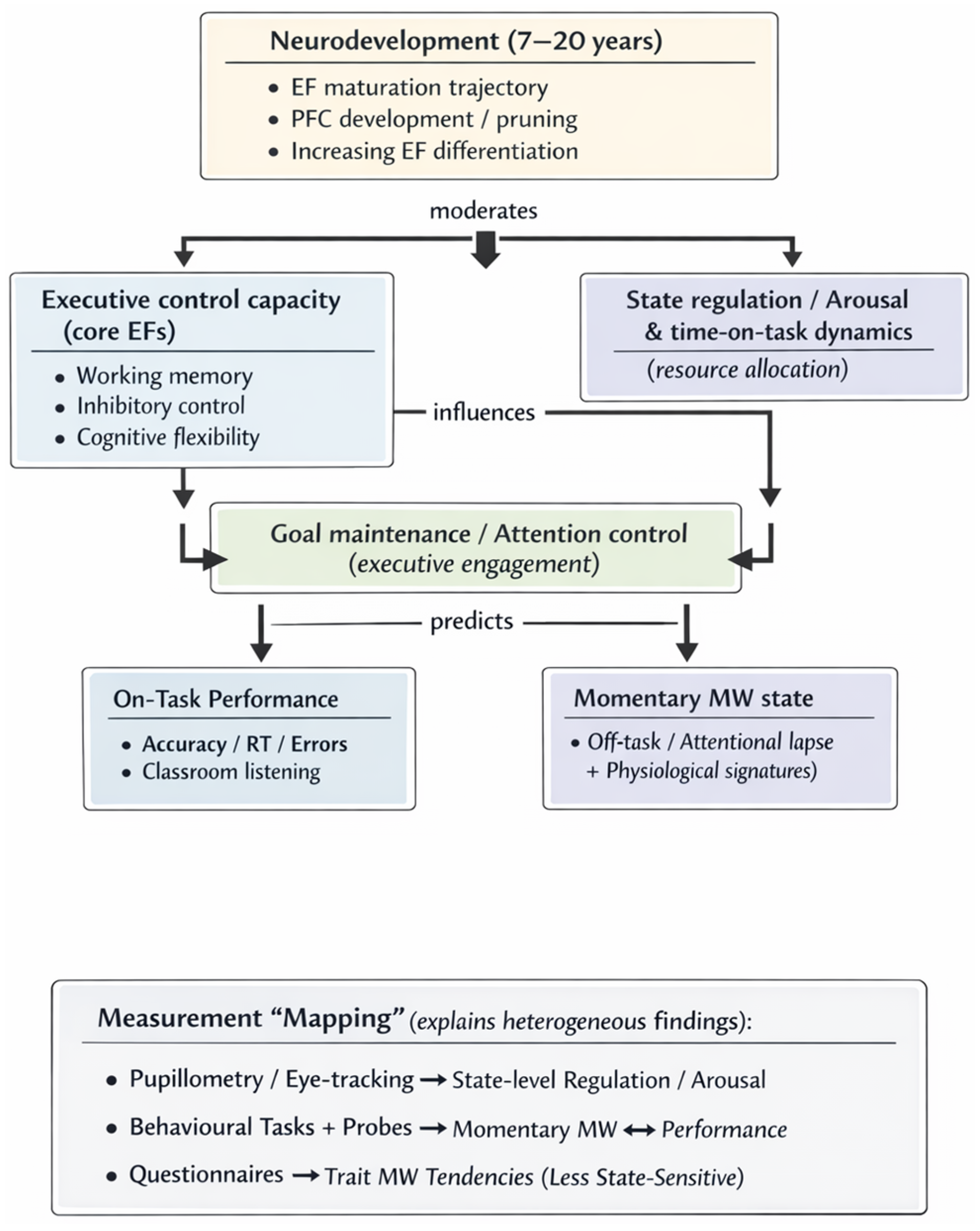 | (Unsworth & Robison, 2017) | Adolescents, university undergraduates (mean age: 19.48 years old) | To explore how WM and executive attention control relate to off-task thinking and physiological indicators. | Behavioural EF battery + pupillometry + self-report; latent-variable SEM | Executive attention and WM tasks; self-report probes and pupillometric measures | Off-task MW states were related to slower reactions times, reduced accuracy rates, smaller pupil diameters. Off-task thinking predicted lower attention control and WM. |