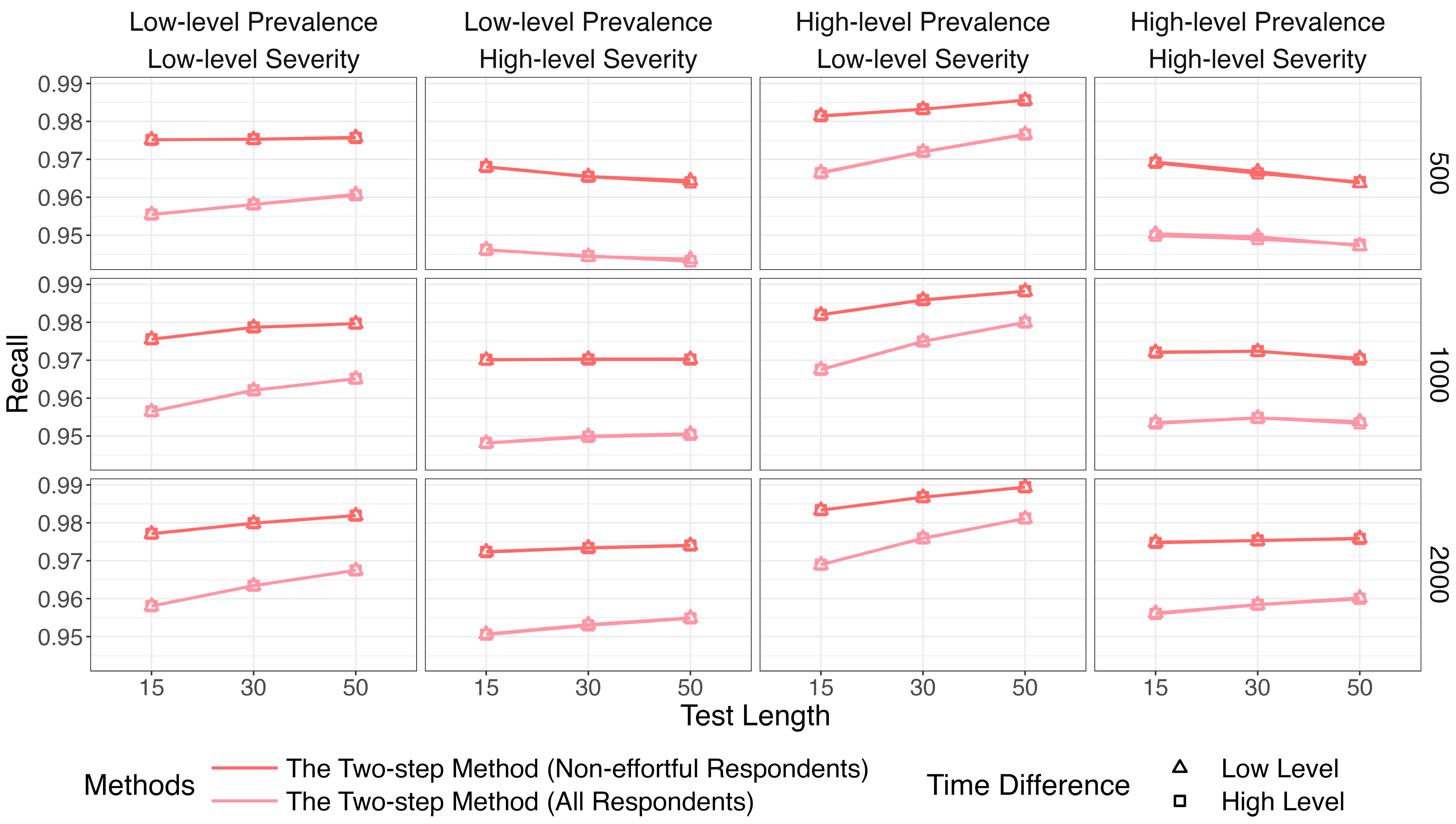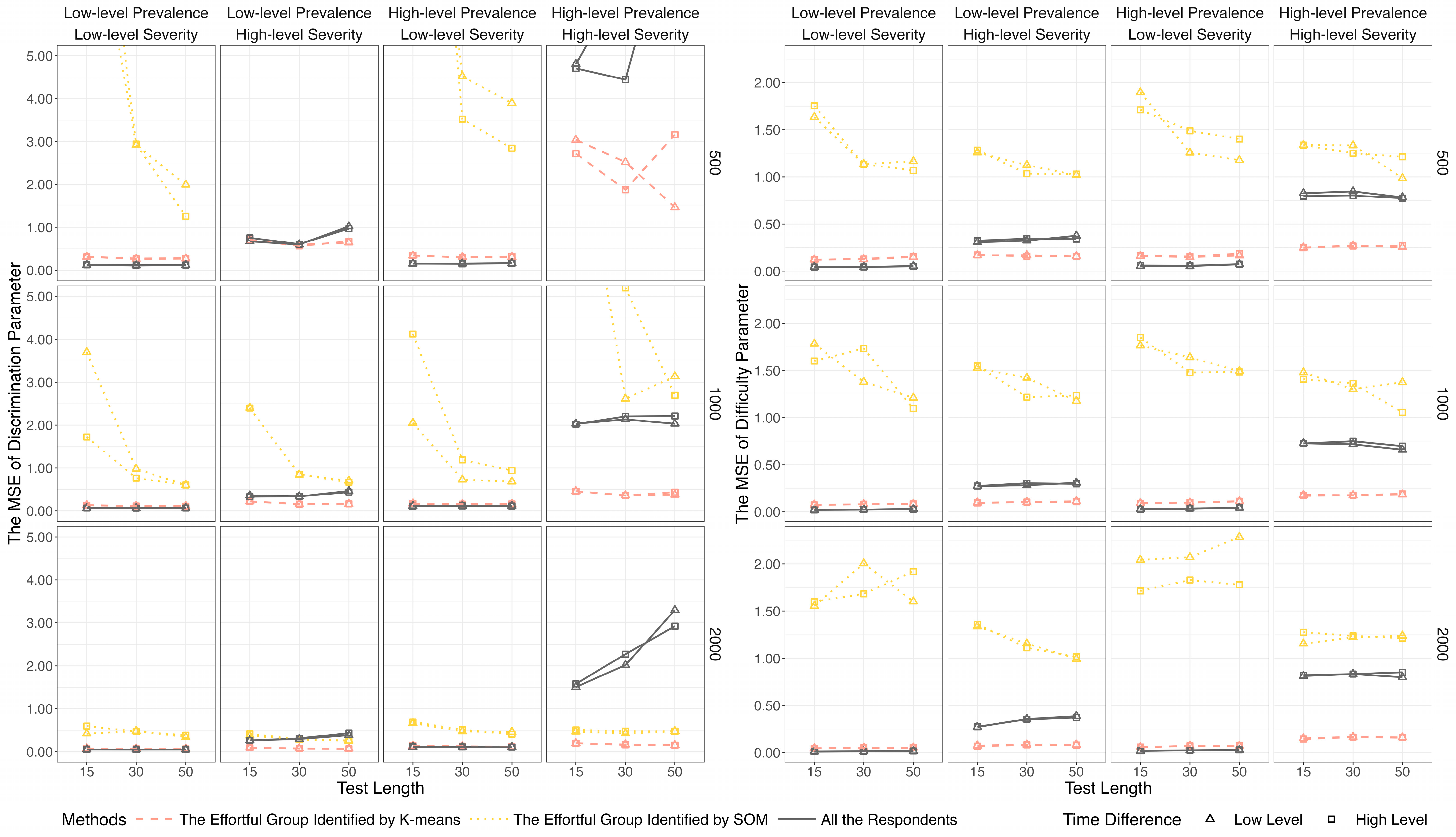 - Using the above estimates, compute for all the respondents. Alternatively, only respondents with the non-effortful label in the first identification are identified for the second time. This is because the non-effortful respondents ignored by K-means and SOM in the first identification are possibly undetected by in the second identification. The non-effortful respondents, these three methods distinguished, are similar due to the similar identification strategy (i.e., based on the similarity between respondents). Man et al. (2019) found that compared with traditional person-fit statistics, the unsupervised learning algorithms would likely correctly flag a larger percentage of non-effortful respondents at the price of a lower identification rate of normally behaved respondents. So, the non-effortful identified by are possible to be included in the non-effortful group identified by the other methods.