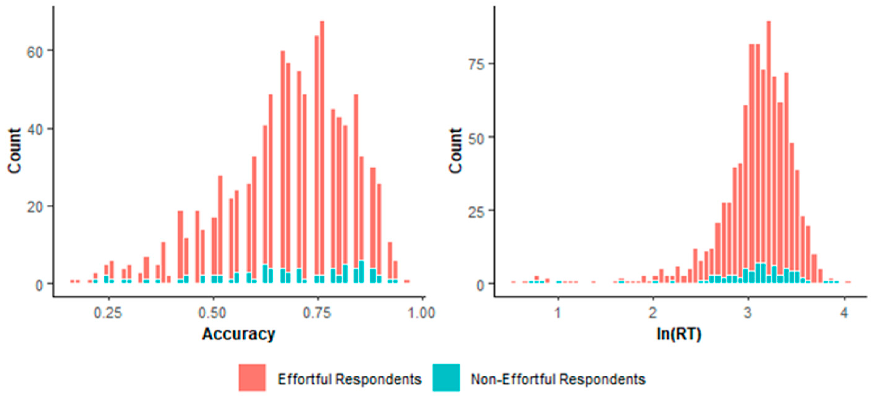 - Liu, Y., Cheng, Y., & Liu, H. (2020). Identifying effortful individuals with mixture modeling response accuracy and response time simultaneously to improve item parameter estimation. Educational and Psychological Measurement, 80(4), 775–807. [Google Scholar] [CrossRef]