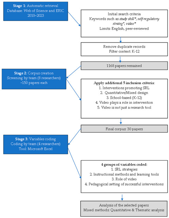 To address the four research questions guiding the systematic review, four groups of variables were coded in Microsoft Excel for each paper in the corpus: (a) variables related to the SRL strategies that the interventions aimed to promote; (b) variables related to the instructional methods and learning tools that the interventions implemented to promote SRL; (c) variables related to the role of the video employed; (d) the pedagogical settings that lead to a successful intervention program. The principal researcher coordinated the coding process by holding regular discussions with team members, clarifying the four groups of variables, and resolving any discrepancies. The current literature review employs a mixed-method approach. Some of the research questions require a quantitative analysis of the data. Beyond that, there are sections where the answers to the research questions are open-ended.