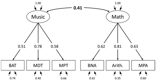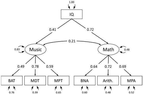 Numerous studies have aimed to improve mathematical achievement via musical interventions because it is argued that music and mathematics draw on related representations and similar skills. However, findings on their effectiveness are inconclusive. This might be because studies neglect to investigate the cognitive mechanisms that might link musical and mathematical abilities. Therefore, this study aimed to systematically investigate the relationships between facets of musical and mathematical ability while taking into account intelligence as a possible explanation for this link. Among 170 young adults with backgrounds in mathematics and/or music, as well as control subjects, we measured mathematical abilities using basic numerical abilities, arithmetic fluency, and higher mathematical competencies. Musical abilities were assessed using beat alignment, mistuning perception, and melodic discrimination. Intelligence was assessed using a verbal, figural, and numerical scale of an intelligence test. Using a latent variable model, we found a moderate to strong positive association between mathematical and musical abilities. However, after including intelligence as a predictor for both mathematical and musical abilities in our model, the relationship between mathematics and music became nonsignificant. These results imply that intelligence accounts for a substantial proportion of the association between mathematical and musical abilities. Full article
