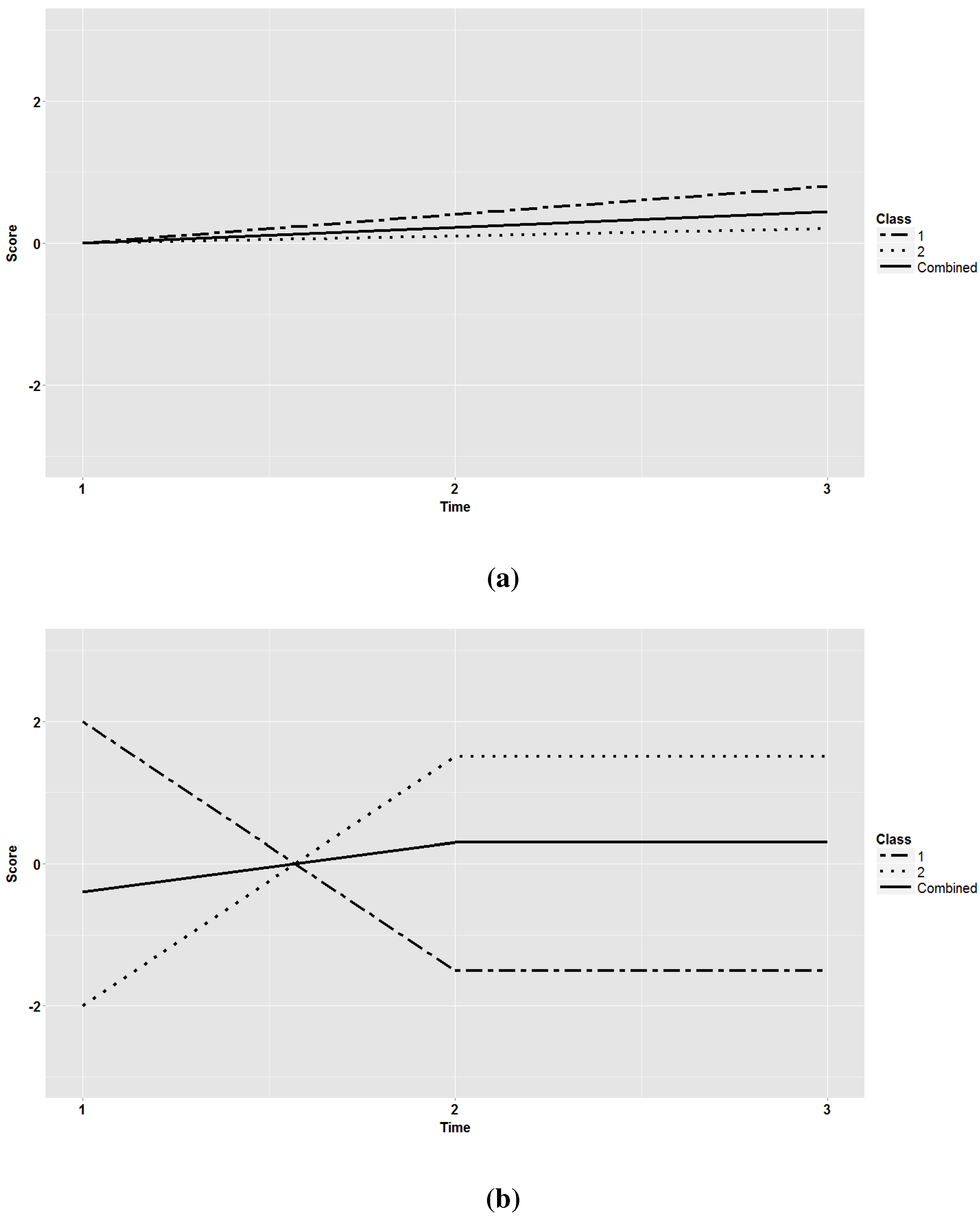 Class-specific and combined growth models. (a) Linear (non-crossing) growth model; (b) quadratic (crossing) growth model.