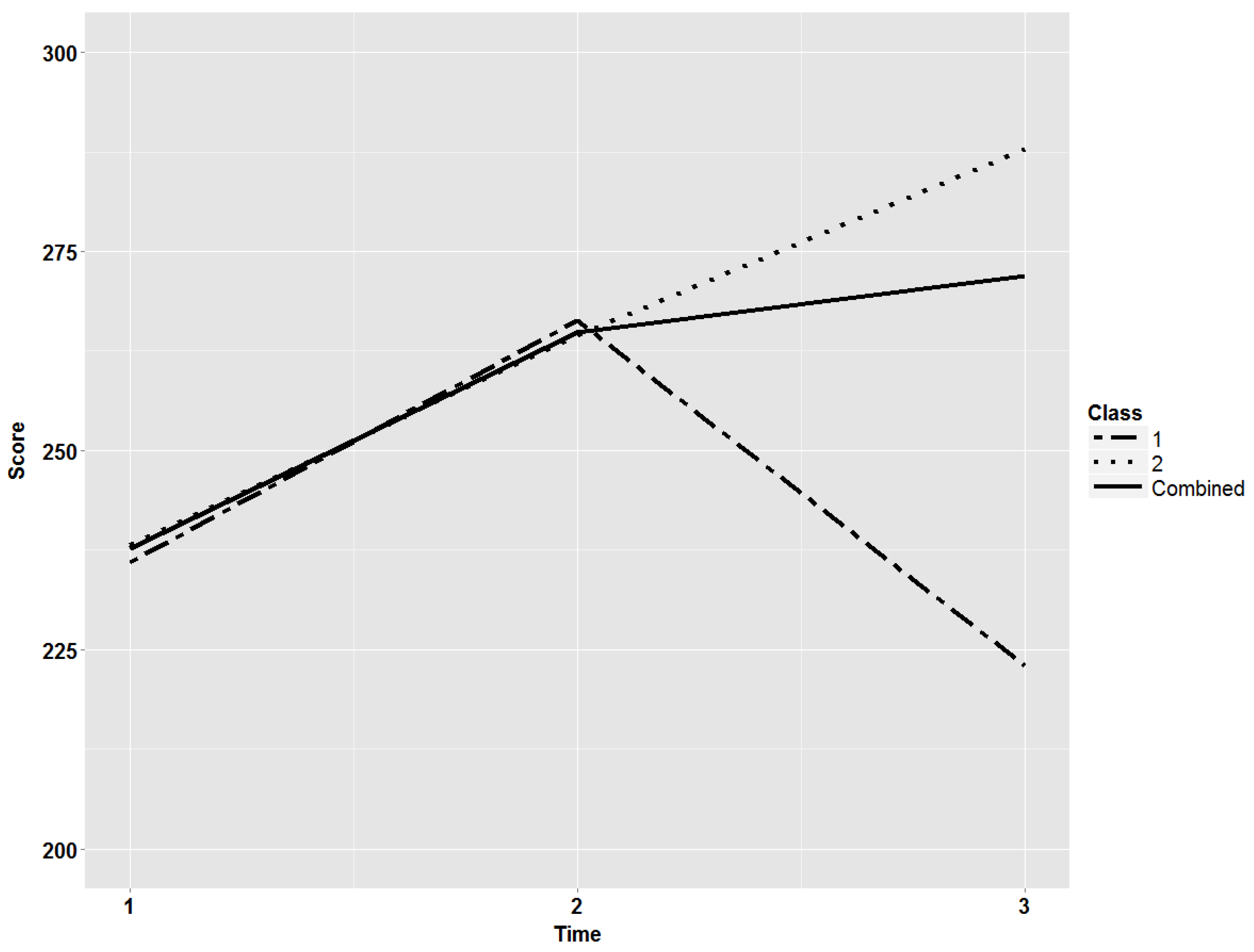 Class-specific and combined growth patterns from matched respondents collected from three waves of Estonian National Intelligence Test scores.