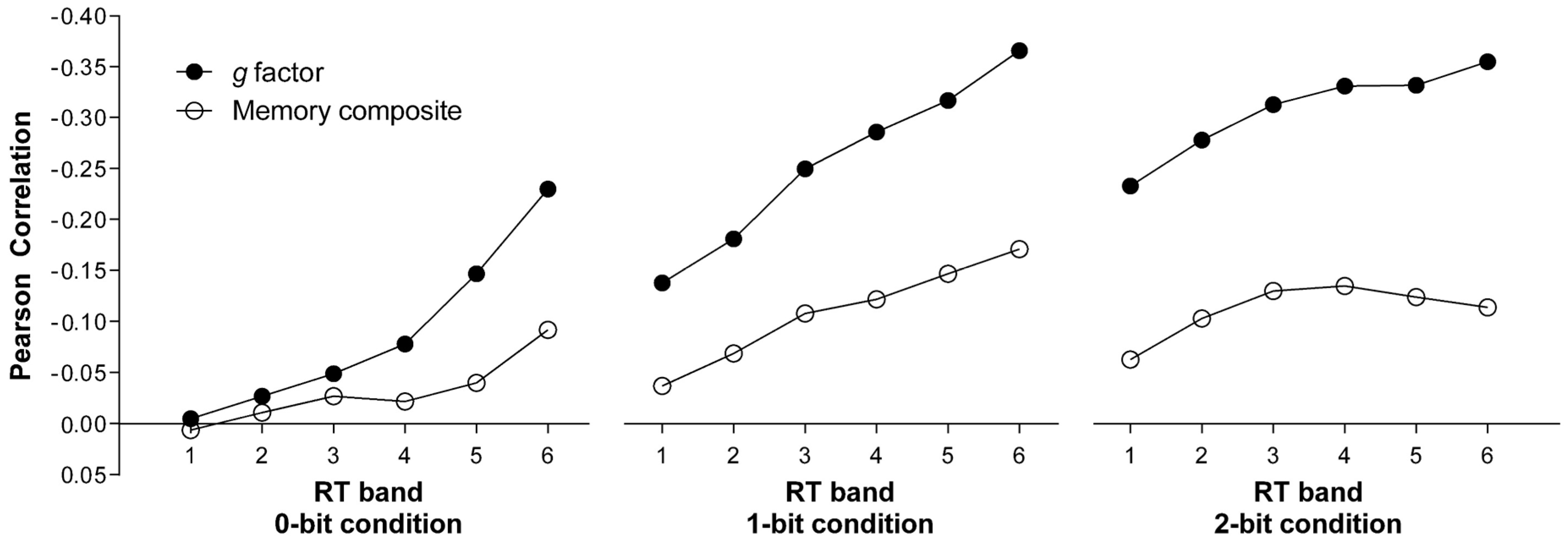 Correlations between successive RT bands (from fastest to slowest) and the high (g factor) and low (memory composite) g-saturated measures of intelligence in the three Hick RT task conditions.
