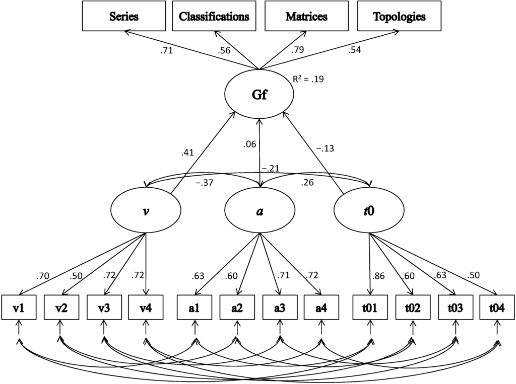 We were able to confirm that individual differences in the eGM and the main DDM parameters are generalizable across different tasks and are meaningfully correlated with each other for a sample of children and adolescents aged between 8 and 18. In addition, we observed that latent factors related to ISV predict gf better than latent factors related to mean speed. We found that σ but not τ from simple CRTs was a significant predictor of gf. The DDM drift rate parameter was closely related to gf. Our results suggest that the WPR may not hold for a sample of children and adolescents of broad age and that drift rate and τ may be less associated with intelligence than expected.