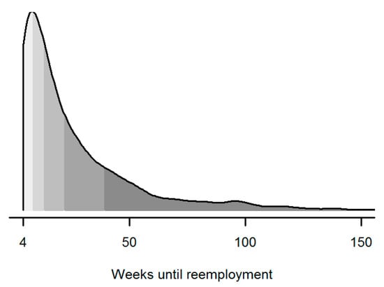 Distribution of weeks until reemployment. Each shade represents 20 percent of the sample.
