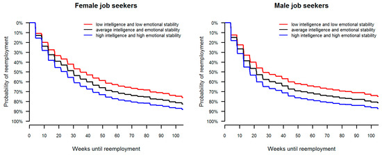 The limitations of the present study point at intriguing opportunities for future research. For one, the study considered a rather short period of only six years. It might be informative to investigate longer periods of unemployment to examine whether the identified effects can be replicated for the long-term unemployed. Furthermore, the presented analyses were stratified by sex because of different baseline hazard rates for men and women. This might reflect the well-known effects of household composition on female labor participation [57,58]. The decision of many women to assume paid employment strongly depends on the presence of an additional earner in the household [59]. Thus, the present research should be extended in future studies by controlling for income effects of a second earner to study sex differences in reemployment success. Future research is also encouraged to examine the effectiveness of job-search programs for different subgroups of individuals. Thus, it might be conceivable that intervention programs aimed at boosting self-presentation or stress-managing skills might be more effective for job seekers low in emotional stability, whereas those with high emotional stability might profit more from trainings of specific job search skills [10]. Finally, the present study was limited to one specific aspect of reemployment success, namely, the time to reemployment. Future studies could extend these findings by addressing more qualitative components of reemployment success such as the match between a job seeker’s job expectations and her or his realized job conditions. Individual differences, particularly in personality traits, might explain why some individuals might be content with the “first best” job, whereas others are more selective in their job choice.