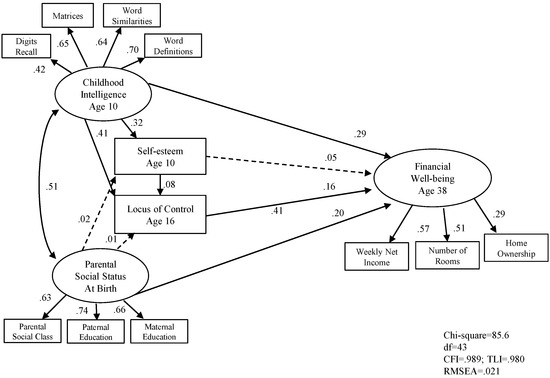 This study explored the effects of a set of socio-economic and psychological factors in childhood and adulthood on adult financial well-being, using structural equation modelling and drawing on data collected from a large representative population sample in the UK. Its primary aim was to examine the relative power of individual difference factors measured before adolescence particularly intelligence, over social class, in predicting adult financial success. Specifically it was hypothesised that (H1) Parental social status would be a significant predictors of adult financial well-being; (H2) Childhood intelligence would be a significant predictor of adult financial well-being; (H3) Locus of control would be a significant predictor of adult financial well-being; (H4) Malaise would be a significant predictor of the outcome variable; (H5) Educational achievement and occupational prestige would be significant predictors of the outcome variable.