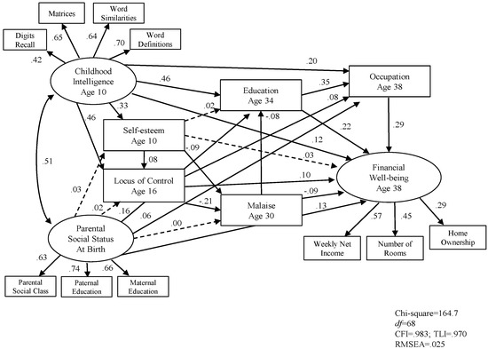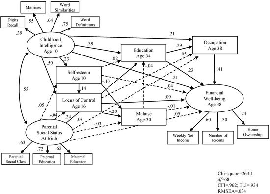 Structural Equation Modelling (SEM) was used to assess the links among family social status, childhood intelligence and self-esteem, locus of control at teen, malaise, educational qualifications and occupational prestige, and current financial well-being. Paths in the models are designed to correspond with the time sequence in which the variables occurred as well as according to the literature in the area. The SEM model testing was carried out using the structural equation modelling program IBM AMOS 22 [36] using maximum likelihood estimation that can be based on incomplete data, known as the full information maximum likelihood (FIML) approach [37].