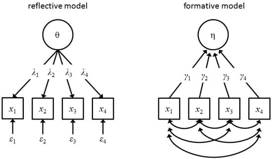 The reflective and formative latent variable model. In the reflective model (left) the latent variable (e.g., temperature) causes the manifest scores (e.g., thermometer values at different locations and times). In the formative model (right) the latent variable (e.g., economical index) summarizes the manifest scores (e.g., economic success of different companies).