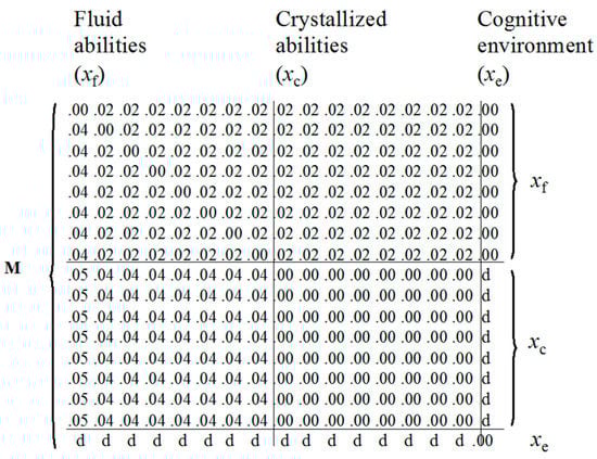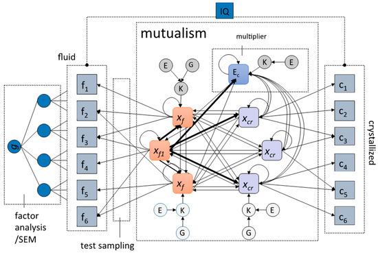 Van der Maas and colleagues combined these insights and proposed the formal unified model of general intelligence that is depicted in Figure 2 [37]. Mutualism forms the core of this model, and the addition of a node representing the environment incorporates Dickens multiplier idea, which also incorporates the training of abilities (see [34]). We account for Cattell’s investment theory [6,38] by separating fluid and crystalized abilities. We also included the idea that some fluid processes are more central (xf1) than others, reflected by stronger connections to other nodes. Such central processes will correlate very strongly with the g-factor extracted from a factor analysis of the separate cognitive ability test scores. All of these explanations can be included into a unified network model (Figure 2) with the specification of M, depicted in Figure 3.