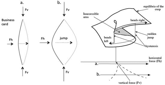 The cusp catastrophe that underlies stage transitions in cognitive development illustrated by the dynamics of a simple business card. Vertical pressure (Fv) on the card is the splitting variable (e.g., test conditions) and horizontal pressure (Fh) is the normal variable (e.g., instruction). With low vertical pressure (path a), switches in the middle point of the card are continuous, with high vertical pressure (path b) they are sudden, exhibiting hysteresis, bimodality, divergence, and other typical characteristics of phase transitions.