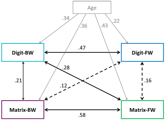 Correlations between age and the four WM aspects as well as partial correlations after controlling for age between the four WM aspects. Digit-FW = digit forward; Digit-BW = digit backward; Matrix-FW = matrix forward; and Matrix-BW = matrix backward. Solid lines represent significant correlations (p < .05), dashed lines represent non-significant correlations (p > .05).