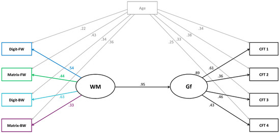 In a next model, we investigated the predictive power of WM and age onto Gf. For this, we built a further model (Model 1b). Model 1b was computed equally as Model 1a, except that each Gf task was no longer regressed onto age. Instead, the Gf factor was regressed onto age to determine the direct and overall effect of age on Gf. In addition, Model 1b generated an excellent fit [χ2 (21) = 19.48, p = .55, normed χ2 = .93; CFI = 1.00; RMSEA = .00; SRMR = .04]. Together, WM and age explained 84% of the variance in Gf (see Figure A1 in Appendix A with further results of Model 1b). Because there was only one task per WM aspect, we were not able to further analyze the structure of WM [35].
