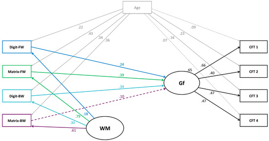 Structural equation model (Model 2b) testing the relations between working memory (WM) aspects, age and fluid intelligence (Gf). Digit-FW = digit forward; Digit-BW = digit backward; Matrix-FW = matrix forward; Matrix-BW = matrix backward; CFT 1–4 = subtests of the CFT 20-R. Solid lines represent significant paths (p < .05), dashed lines represent non-significant paths.