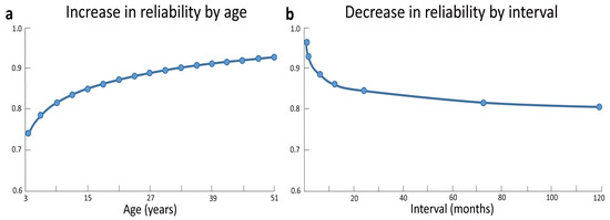 A first aspect concerns the stability of intelligence over time. There is broad agreement that the stability of intelligence depends on the specific age range considered (e.g., [34]). Most studies did not find good longitudinal consistency in intelligence scores between preschool years and later stages in development (e.g., [35,36]), with cognitive abilities becoming relatively stable only from childhood onwards (e.g., [37,38,39]). By reviewing a number of studies in the literature, Schuerger and Witt [40] found that in about 13% of the 6-years-old scores changed at least of one standard deviation (i.e., a huge change, considering that standard intelligence tests have a mean of 100 and a standard deviation of 15) and the same was true in 7% of the 30-years-old. Indeed, a drastic increase in test-retest reliability occurs as a function of age, with less stable scores in childhood and adolescence compared to adulthood (see Figure 1a). Along these lines, a recent study revealed that, despite a good test–retest correlation across a two-year interval (r = .81 for Full Scale IQ), 25% of typically developing children and adolescents showed changes of nine points or more across this interval [41]. Similarly, correlations between cognitive abilities at the age of 17 and measures taken during preschool years increased from r = .16 at the age of 1 year to r = .44 at the age of 3.5 years, with coefficients becoming increasingly stronger at the time of school enrolment (six years; r = .67) and later on during school years (eight years; r = .77) [42,43], and especially from the age of 11 years onward [44]. It is worth noting, however, that even during late childhood significant increases and decreases in individual levels of IQ are not uncommon. These fluctuations have often been ascribed to measurement error [45]. However, some of these fluctuations can also represent true changes in cognitive abilities, as evidenced by parallel changes at the brain level (see the next section).
