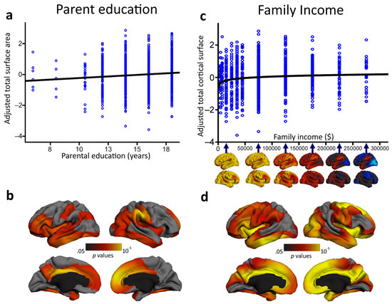 In a cohort of 1099 typically developing individuals between 3 and 20 years of age, parental education was found to be significantly associated with children's total cortical surface area (a) in different brain regions associated with language, reading, and various executive functions and spatial skills (b). Family income was significantly logarithmically associated with children's total cortical surface area (c) in widespread regions of children's bilateral frontal, temporal and parietal lobes (d). Adapted and reprinted with permission from Macmillan Publishers Ltd: Nature Neuroscience [127] © (2015).