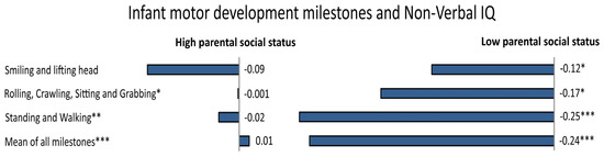 In a large Danish sample, the association between several specific infant motor developmental milestones and adult Non-Verbal IQ was moderated by parental social status (p-values immediately after the text, represented by the symbol *, indicate the level of significance for the interaction term with parental social class). In particular, stronger associations between milestone attainment and adult intelligence in the subsample from low social status families were observed (standardized regression for milestones predicting Non-Verbal IQ are reported). Adapted and reprinted with permission from Elsevier: Early Human Development [156] © (2015).
