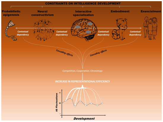 In this section, we will argue that neuroconstructivism [6,7,86], which emphasizes the interrelation between brain and cognitive development, may provide a parsimonious developmental framework to account for the developmental essence of intelligence. In fact, the adoption of a neuroconstructivist approach is particularly relevant for the current state of the art in intelligence research, whereby multiple sources of constraints have been already shown to influence intellectual functioning across developmental time. However, insofar these constraints have not been connected together by a single theoretical framework that emphasizes the dynamic and multilevel nature of this concept. On these grounds, here we attempt to incorporate for the first time these multiple levels into a unified model by taking a developmental perspective.
