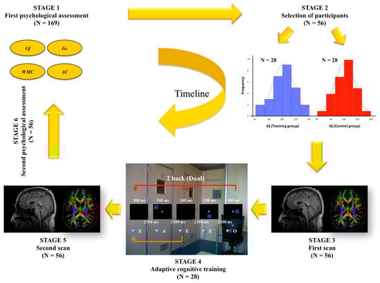 One straightforward test-retest design was the main framework for our research program. Figure 1 depicts the timeline including first psychological assessment (stage 1), selection/recruitment of participants (stage 2), first MRI scan (stage 3), adaptive cognitive training (stage 4), second MRI scan (stage 5), and second psychological assessment (stage 6).