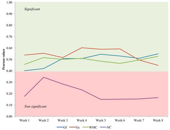 Correlations between baseline cognitive levels (Gf = fluid reasoning ability, Gc = crystallized ability, WMC = working memory capacity, AC = attention control) and adaptive dual n-back performance across weeks. The first four weeks were devoted to visual single n-back and auditory single n-back training.