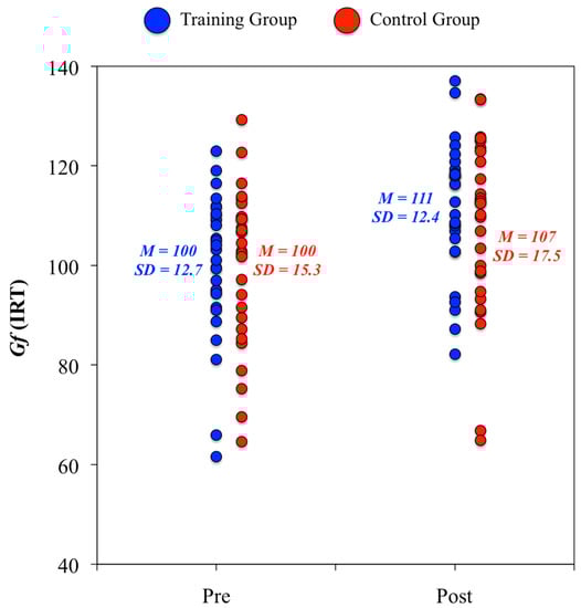 2. At the construct level, we did not find any statistically significant difference between groups from the pretest to the posttest in their psychological evaluations (ANCOVA analyses: DV = score at posttest, IV = group, and Covariate = score at pretest). The standardized change in Gf for the training group was equivalent to eleven IQ points (d = 0.75), whereas this value for the control group was equivalent to seven IQ points (d = 0.51) (Figure 3). There were null pretest-posttest changes in Gc for both groups. Furthermore, it is worth noting that the test-retest correlation in Gf was above 0.80 for the training (r = 0.81) and control (r = 0.84) groups, and, therefore, participants showing higher pretest scores were those showing better posttest scores.
