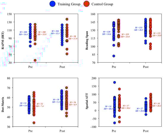 3. As underscored by Colom et al. [] constructs are not homogeneous. Therefore, results at the measures level were also analyzed, again with ANCOVA models, and this led to an interesting revelation: statistically significant group differences favoring the training group were observed for the RAPM test, along with Reading Span, Dot Matrix, and Spatial Attention Control tasks (Figure 4). All these measures require visuospatial processing skills. Therefore, tests and tasks tapping this type of content across cognitive domains (fluid reasoning, working memory, and attention control) were sensitive to training. This finding was consistent with Melby-Lervåg and Hulme’s [] meta-analysis and Stephenson and Halpern’s [] results. In the latter study, significant Gf improvements were observed after intensive training in visuospatial short-term memory tasks.